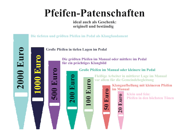 bestimmt die Länge der Pfeife und wird durch das Zeichen ´ angegeben; Bsp.: in der normalen Tonlage ist die tiefste Pfeife eines Registers 8´ lang (also etwa 2,40 Meter), bei einem 16´ doppelt so groß, bei einem 4´ halb so groß, bei einem 2´nochmal halb so groß etc